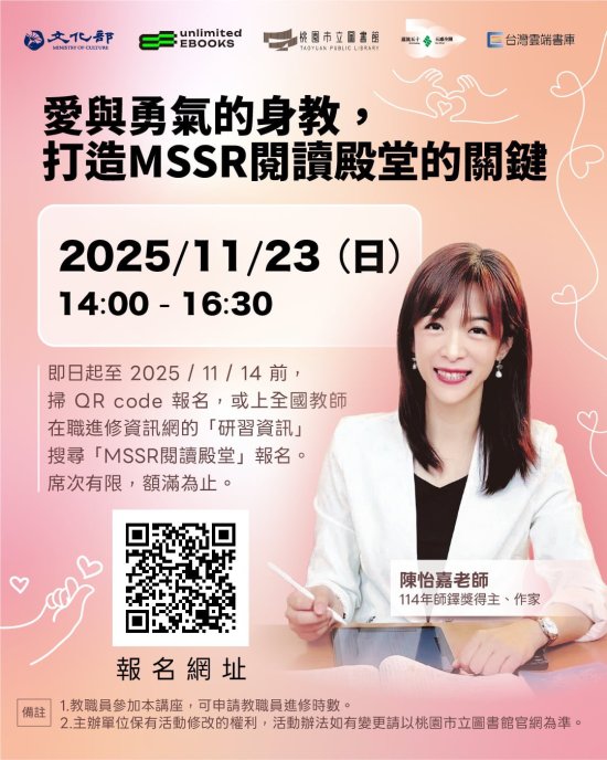 主旨: | 本館與遠流出版事業股份有限公司於114年11月23日舉辦「愛與勇氣的身教,打造MSSR閱讀殿堂的關鍵」講座,請貴校惠予協助宣傳,請查照。 |
