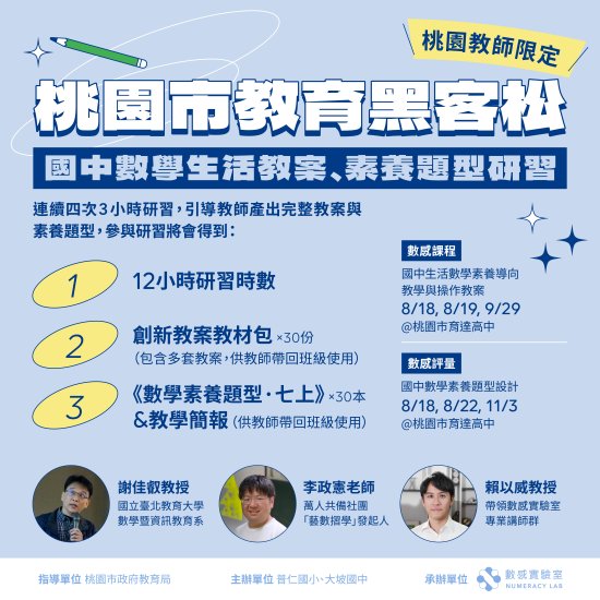 1、 研習對象:桃園市國小教師(年級、科目不限,暑假後為高年級數學授課優先)。