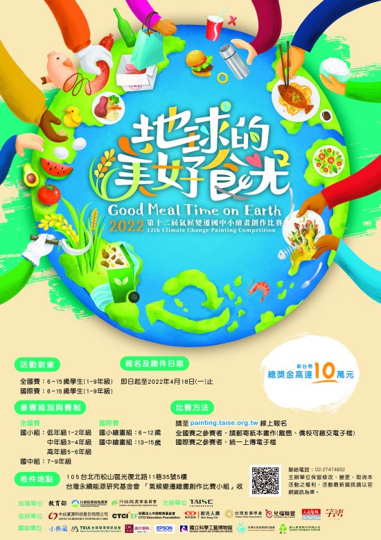 一、 由教育部、行政院環境保護署、行政院農業委員會指導,本會主辦之「氣候變遷國中小繪畫創作比賽」迄今已舉辦11屆,一共累計37國、52,666名學子參與。本屆為第12屆,為呼應聯合國永續發展目標(SDGs)的第2、12項,以「地球的美好『食』光」為主題,強化國中小學生、教師對糧食安全、永續農業、營養均衡與永續消費與生產等相關議題的認知,以及拓展國際觀並付諸實際的氣候行動。比賽也呼應聯合國永續發展目標第13項,鼓勵積極採取氣候行動,並提升大眾相關意識。