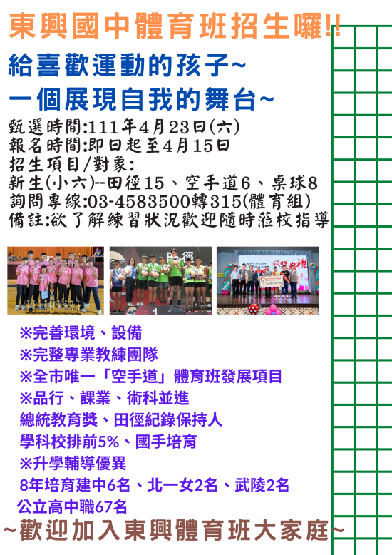 主旨: | 檢送東興國民中學111學年度體育班新生(含轉學、轉班生)入學甄選簡章,敬請惠允協助公告周知,並請鼓勵所屬學生踴躍報名,請查照。 |