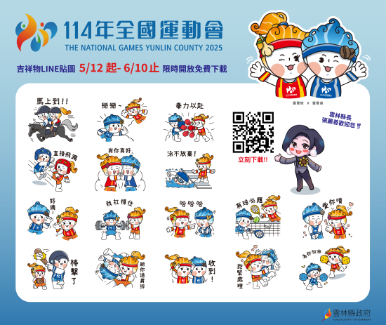 114年全國運動會LINE貼圖自114年5月12日(星期一)至6月10日止開放免費下載,貼圖下載連結如下: